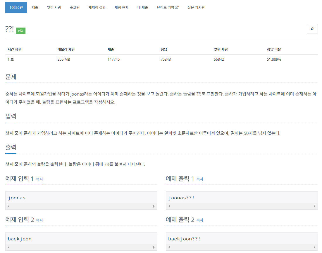 첫째 줄에 준하의 놀람을 출력한다. 놀람은 아이디 뒤에 ??!를 붙여서 나타낸다.