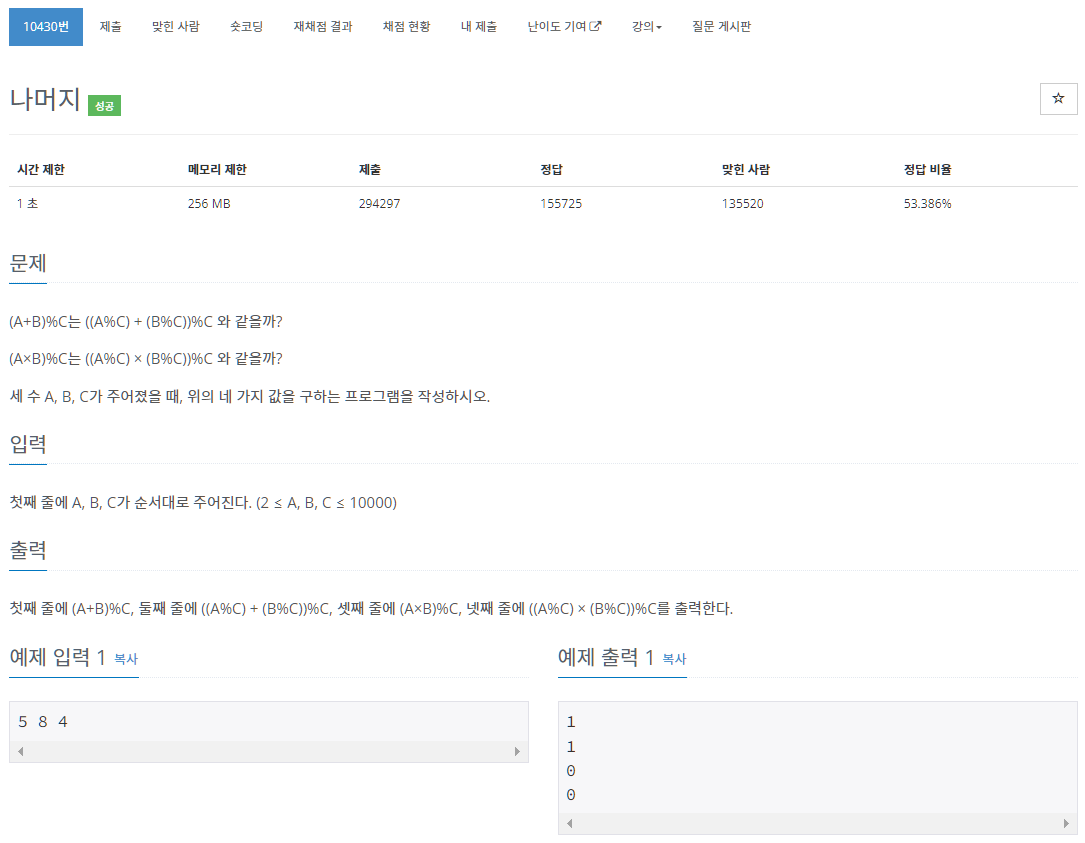 1단계 입출력과 사칙연산의 9단계 10430번 문제입니다