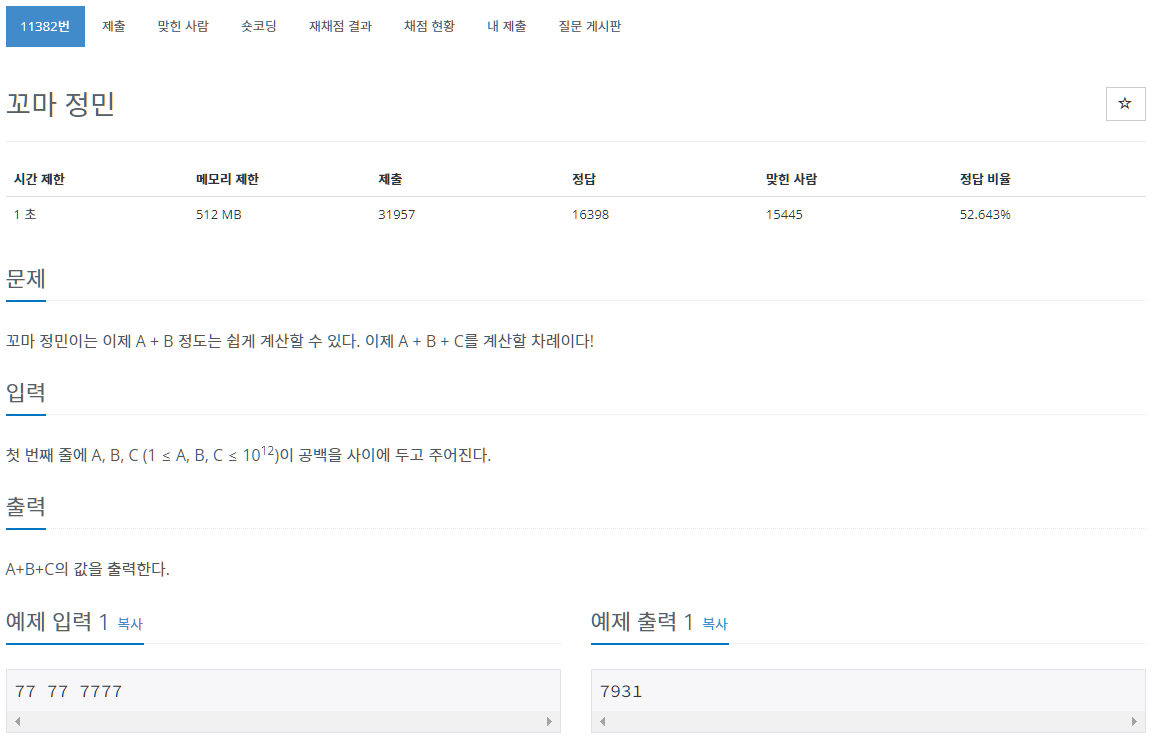 1단계 입출력과 사칙연산의 11단계 11382번 문제입니다