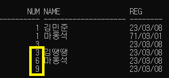 insert into sample(num, name, reg) values (1, '김민준', to_date('2023-03-08'));