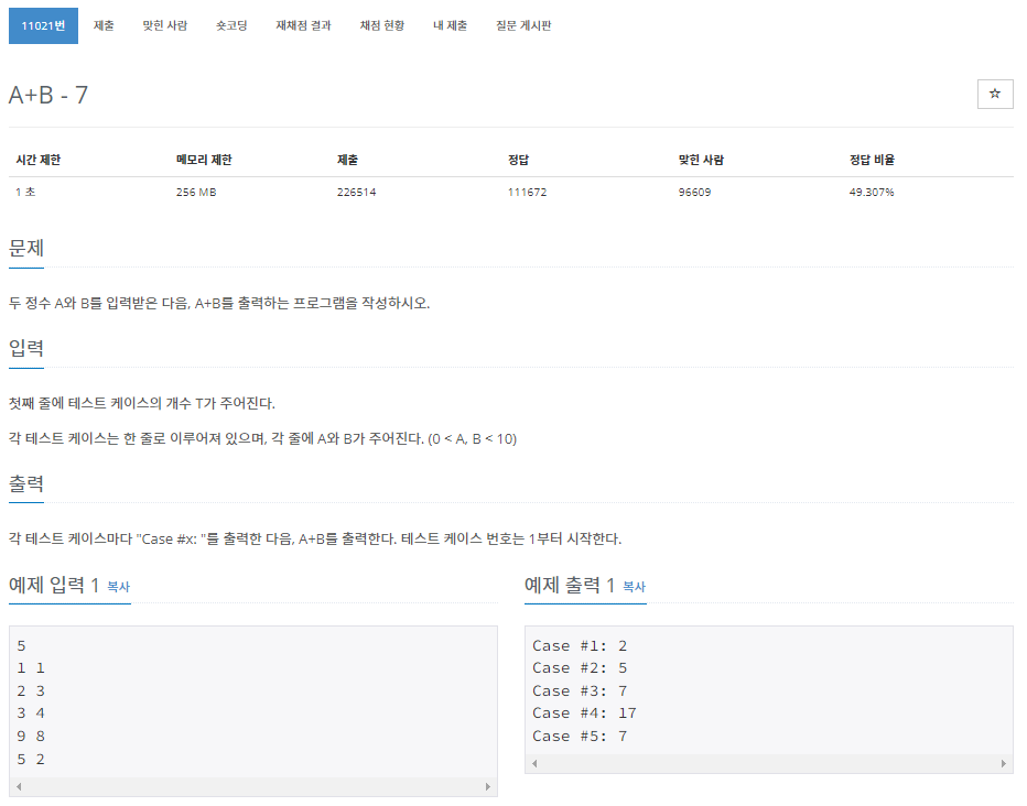 3단계 반복문 7단계 11021 A+B -7 문제입니다
