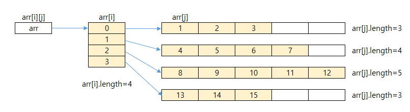 int[][] arr = new int[][]{{1,2,3},{4,5,6,7},{8,9,10,11,12},{13,14,15}};