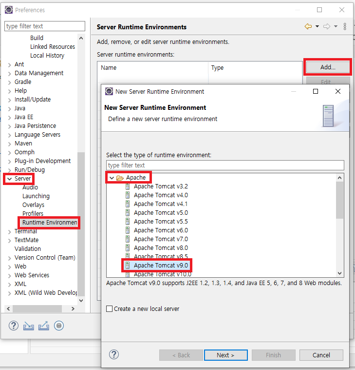 Server > Add > Apache > Apache Tomcat v9.0 > Next