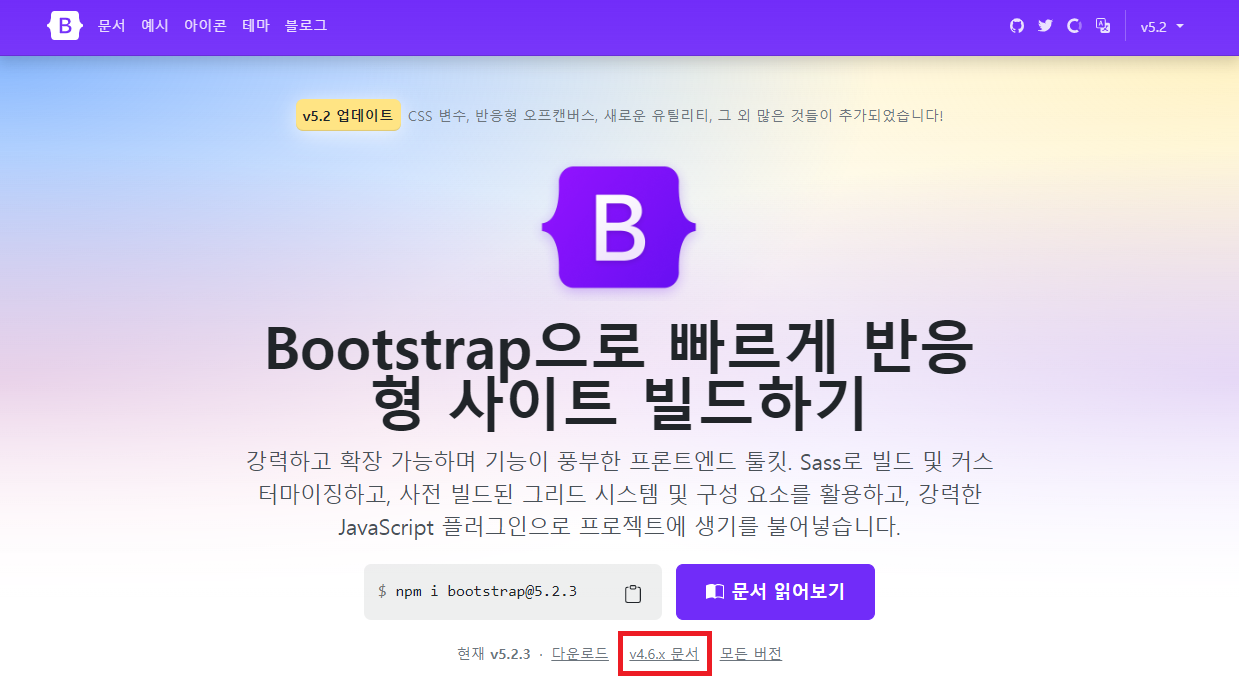 프론트엔드 기본 툴 세팅 : component를 사용하기 위한 기본 세팅 부트스트랩 프론트엔드 툴 접속 https://getbootstrap.kr/ Bootstrap 강력하고 확장 가능하며 기능이 풍부한 프론트엔드 툴킷. Sass로 빌드 및 커스터마이징하고, 사전 빌드된 그리드 시스템 및 구성 요소를 활용하고, 강력한 JavaScript 플러그인으로 프로젝트에 생기 getbootstrap.kr 버전 충돌을 막기 위해 5이하 버전으로 다운로드 Download > Download 다운로드 페이지에서 파일 다운로드 다운로드받은 파일의 압축을 풀고 해당되는 파일을 Eclipse resources폴더에 넣음 bootstrap.min.css파일과 bootstrap.min.js파일을 각각 폴더를 생성해 넣어줌 메인페..