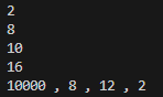 print("{:b} , {} , {:o} , {:x}".format(0x10,0o10,10,0b10))