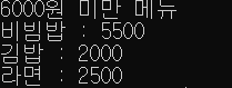 가격이 6000원 미만에 해당하는 메뉴와 가격을 출력하는 코드를 작성하시오.