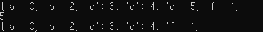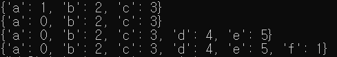 dic.setdefault('f',1) # 하나만 추가 가능 ; 같은 키값이면 아무런 일이 일어나지 않는다