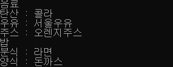 dic = {'음료':{"탄산":"콜라","우유":"서울우유","주스":"오렌지주스"},