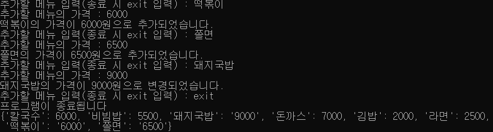 name = input("추가할 메뉴 입력(종료 시 exit 입력) : ")