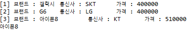 System.out.println("[" + i + "] 브랜드 : " + name + "\t 통신사 : " + tel + "\t 가격 : " + pri);