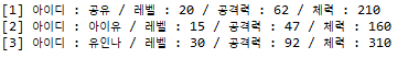 atk hp 공격대상 [1] 뽀로로 10 100 타요 [2] 타요 15 80 뽀로로