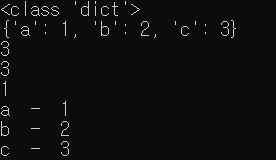 Dictionary(사전형) : 데이터를 구분짓기 위한 값을 index대신 key를 두고 key를 통해서 value값을 가져오는 형식 key와 value 를 1:1한쌍으로 데이터를 저장하는 저장소 value값은 key값을 통해서만 접근이 가능하다 ※ 웹에서 기본적으로 데이터를 주고받는 형식 생성 {}를 이용해서 생성한다 데이터를 넣기 위해서는 key와 value 값을 같이 입력하여야 한다 형식 변수명 = {key:value , key:value , key:value...} 호출 변수명[key] dic = { 'a' : 1, 'b' : 2,'c' : 3} print(type(dic)) print(dic) print(dic.__len__()) print(len(dic)) print(dic['a']) for ..